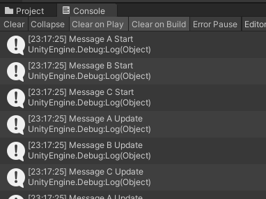 public class MessageA : MonoBehaviour { // Start is called before the first frame update void Start() { Debug.Log("Message A Start"); } // Update is called once per frame void Update() { Debug.Log("Message A Update"); } }
